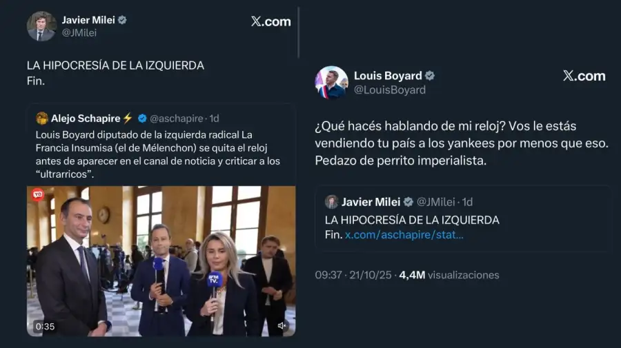 El presidente Javier Milei protagonizó un llamativo cruce con el joven diputado francés Louis Boyard, integrante del partido de izquierda radical La France Insoumise (LFI), luego de que el legislador de 25 años fuera captado quitándose discretamente un reloj poco antes de hablar con la prensa, un gesto que se volvió viral en redes.