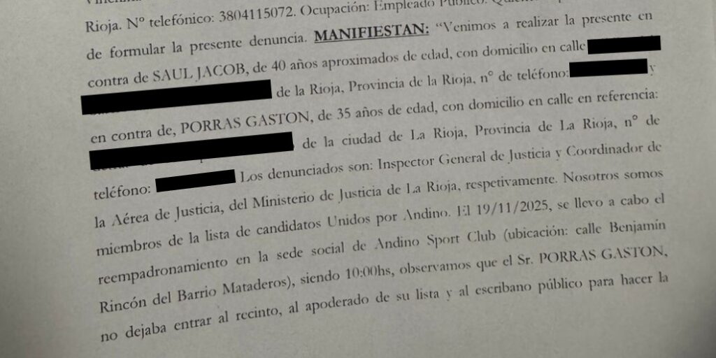 Los graves hechos denunciados fueron el jueves pasado en la sede del Club Andino, cuando se citó a los socios para el reempadronamiento y habilitación para votar en las elecciones a realizarse el próximo 27 de noviembre.