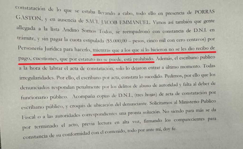 Para tal fin, se cobró el monto de $5.000 por persona, sin entrega de recibo por el pago, y no dejando inspeccionar a integrantes de la lista opositora, el padrón final, ni la rendición del dinero recaudado, que estiman en unos 10 millones de pesos.