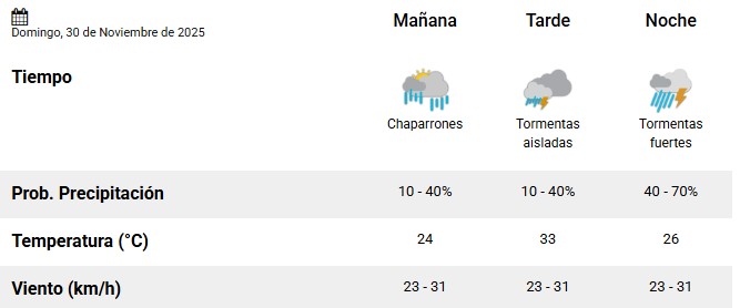 Para este lunes, tormentas aisladas por la madrugada y noche, máxima de 30 grados.
