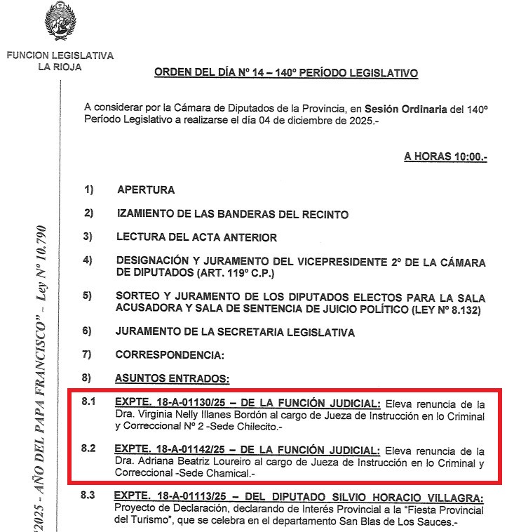 Ya en Asuntos Entrados, por mayoría, se aprobaron las renuncias de Virginia Illanes, al cargo de jueza de Instrucción en lo Criminal y Correccional N° 2 de sede Chilecito; y de Adriana Loureiro, al cargo de Jueza de Instrucción en lo Criminal y Correccional de la sede Chamical.