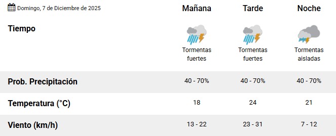 Para este domingo se esperan tormentas aisladas, con una mínima de 18 grados y una máxima de 24ºC.