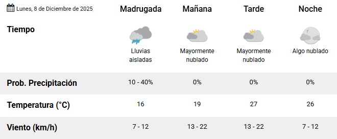 Para el lunes 8 de diciembre, se pronostican lluvias aisladas por la mañana y cielo mayormente nublado con una mínima de 16ºC y una máxima de 27 grados.