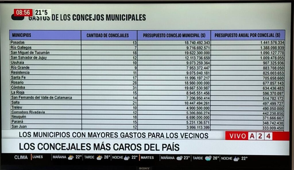 Según el cuadro publicado por el canal de noticias, el Concejo Deliberante de la Ciudad de La Rioja maneja un presupuesto anual de $8.945 millones, una cifra exorbitante si se compara con la escala del municipio, la cantidad de habitantes y la calidad de servicios que recibe la ciudadanía. La cuenta es todavía más contundente cuando se divide el monto entre los 15 concejales que integran el cuerpo: cada uno de ellos demanda, en promedio, $596 millones por año al presupuesto municipal. Es decir, casi seiscientos millones por edil para una institución que sesiona poco, fiscaliza menos y mantiene una estructura interna cuyo funcionamiento real pocas veces se transparenta ante la opinión pública.